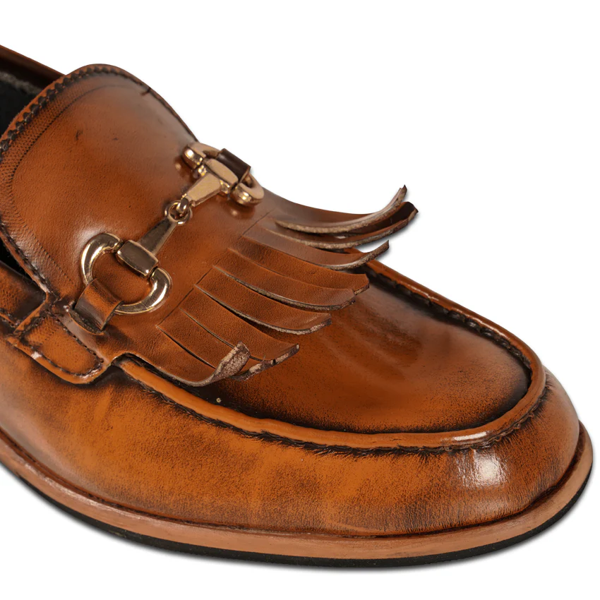 An adorable one-of-a-kind design with fringe and metal buckle details on the front. Inspired by the classic fashion of 1930 with a modern twist, this pair has a refined glazy finish and assures a comfortable wear for your daily companion.